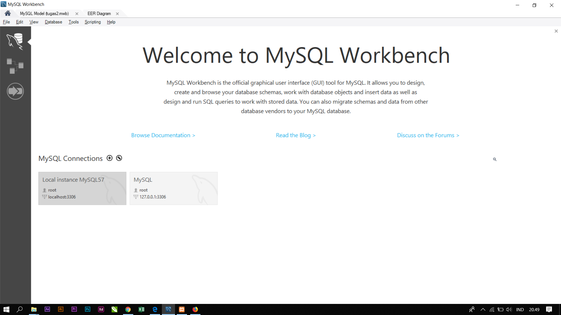 Cara Menginstall MySQL WorkBench di Komputer berbasis Windows. Langkah pertama jalankan MySQL Workbench. Model ERD dibuat menggukana tools MySQL Workbench tentunya menggunakan versi community.